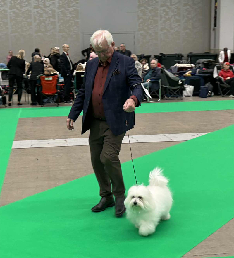 Domarkritik: Tilltalande tik,vacker helhet, vackra ögon, korrekt överlinje, bra front, välformad bröstkorg, bär sin svans väl, rör sig med typiska steg, utm päls